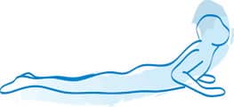 Lie on your stomach. Place your hands facing down on the floor beside your ears. Supporting your weight on your palms, push up and raise the chest, looking up towards the ceiling. Breathe in while rising, and hold your breath in that position for 8 seconds. Come down to the original position while breathing out. Practice eight times.