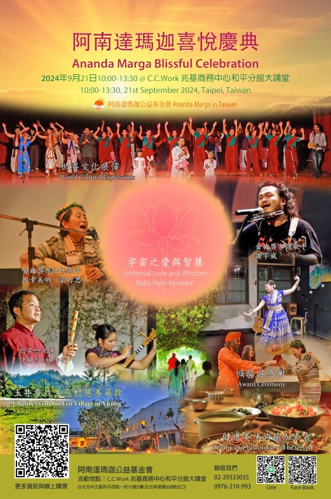 這次的活動名為「喜悅慶典」,旨在透過一系列精彩的活動與大家分享喜悅。我們邀請了RAWA的藝術家們呈現富有啟迪和精細理念的藝術表演。包括:新時代音樂–曙光之歌;世界文化展演 (地方民謠與傳統藝術)–印度舞蹈、原民音樂、台語唸歌說唱藝術、俄羅斯民謠等;Kiirtan靈性頌舞;瑜伽舞蹈等有助於人類精神層面提升與發揚世界與地方文化的表演。此外,我們還將分享基金會近年來項目的成果,並舉辦頒獎典禮,向長期支持基金會公益項目與阿南達瑪迦理念的朋友們表達由衷的感謝。活動中還將提供美味的素食餐會,與大家共度這段美好的時光。